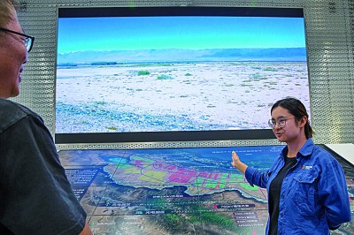 龍羊峽水光互補發電站的講解員楊若怡向來賓介紹當地生態逐漸向好的過程。