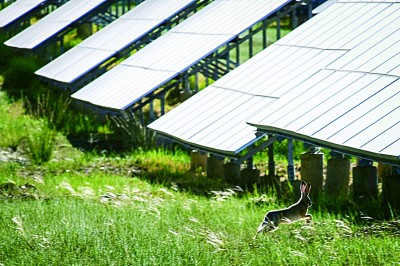 一隻野兔在光伏板之間跳躍而過。生態改善後,園區吸引了許多野生動物棲息。