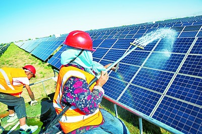 光電園區的工作人員正在清洗光伏板。