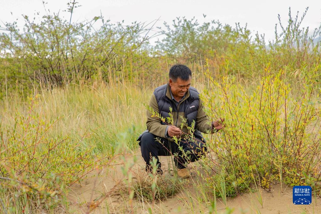 瑪曲縣自然資源局高級工程師馬建雲(yun) 在黃河瑪曲段幹流沿岸的一處阻沙林帶建設區域觀察草方格沙障內(nei) 植被生長情況(9月16日攝)。新華社記者 郎兵兵 攝