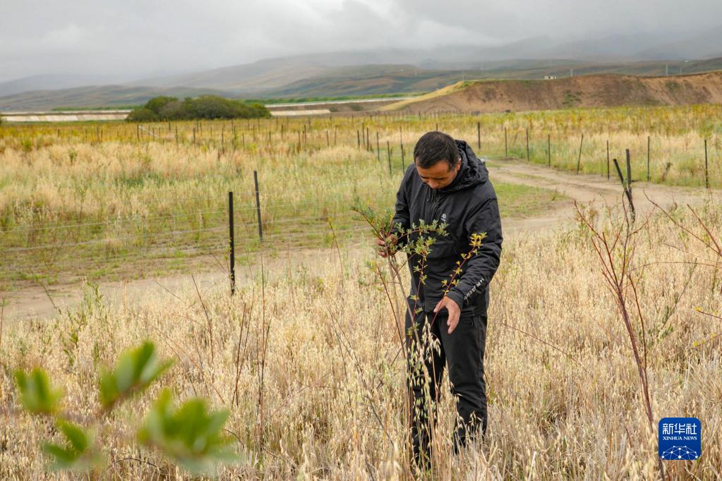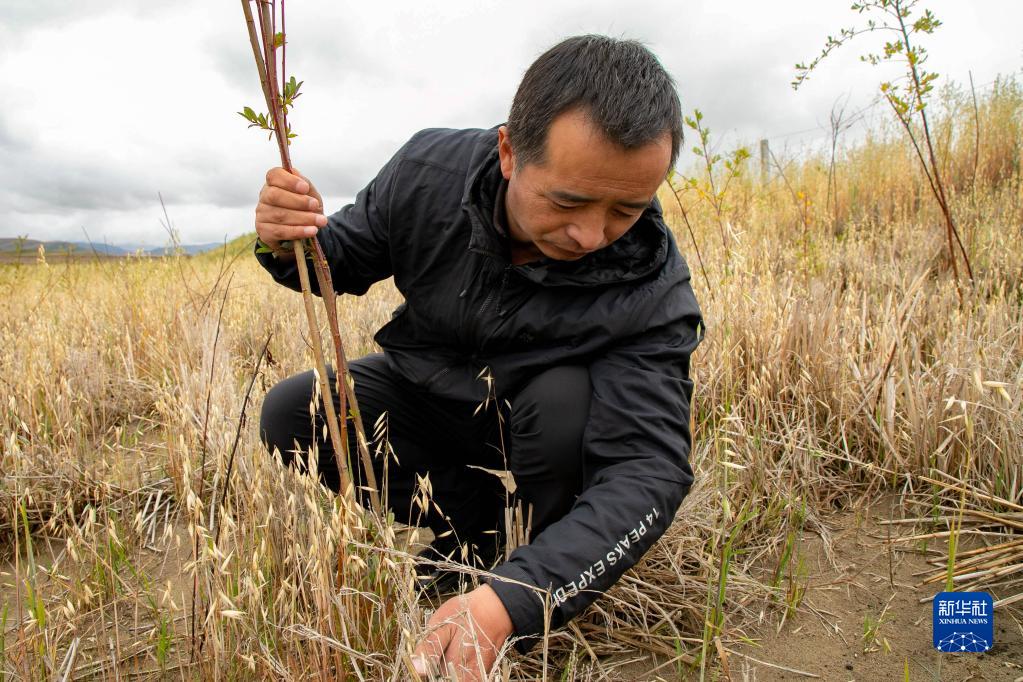 瑪曲縣自然資源局高級工程師馬建雲(yun) 在黃河瑪曲段幹流沿岸一處阻沙林帶建設區域觀察植被生長情況(9月16日攝)。新華社記者 郎兵兵 攝