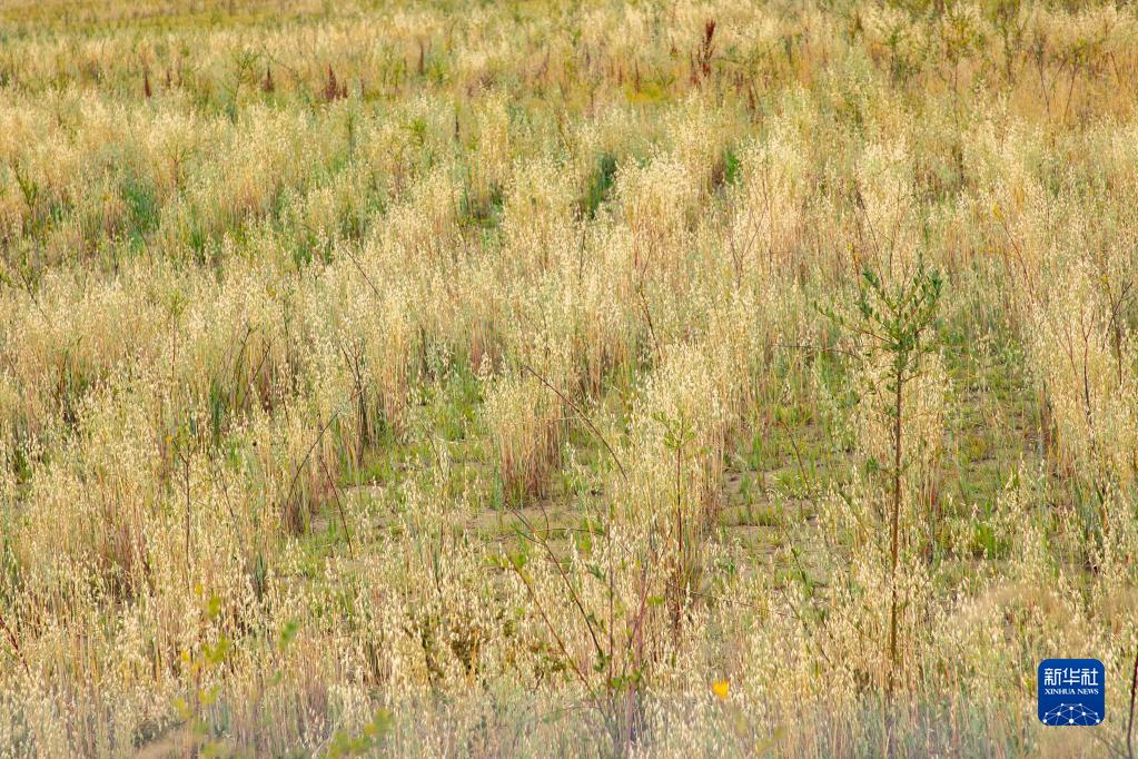 這是黃河瑪曲段幹流沿岸一處阻沙林帶建設區域的草方格沙障內(nei) 的植被(9月16日攝)。新華社記者 郎兵兵 攝