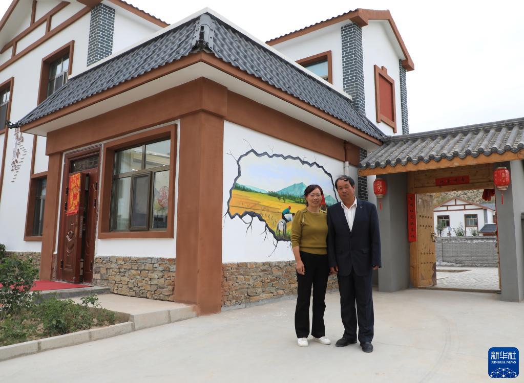 9月15日,在甘肅省武威市祁連鎮祁連村下河安置點,村民鄧發斌和妻子在新房門前合影。新華社記者 張智敏 攝