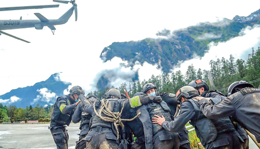 “9·5”地震發生前兩(liang) 周,特警支隊舉(ju) 行了一次警務技能大比武。比武科目包括高海拔山地武裝奔襲、簡易擔架製作、傷(shang) 員應急處理、傷(shang) 員轉運、結繩……兩(liang) 周後,他們(men) 來到另一個(ge) 比武場,這一次是與(yu) 死神較量。