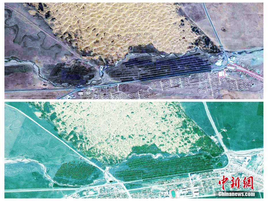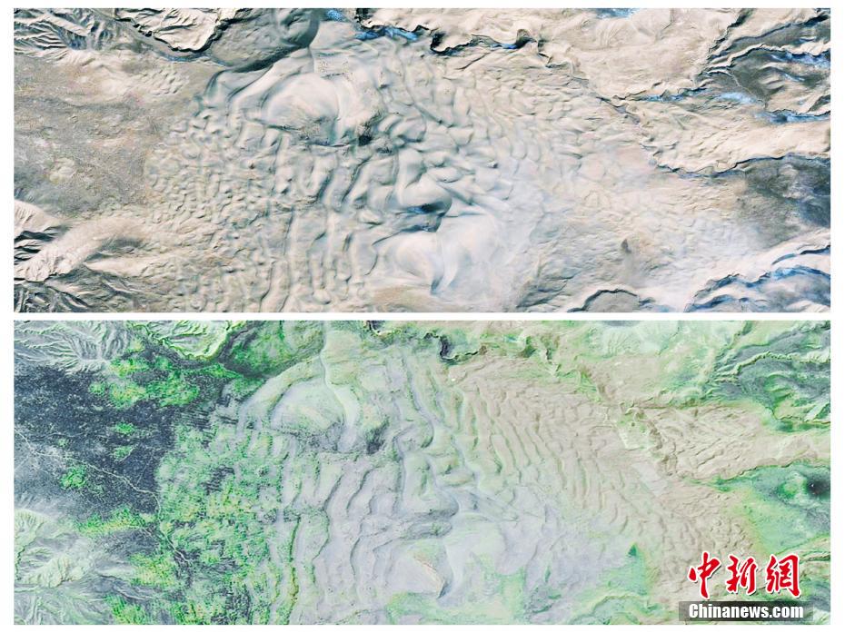 圖為(wei) 青海省海南州貴南縣黃沙頭2013年(上圖)和2022年(下圖)治理對比。彭璽 供圖