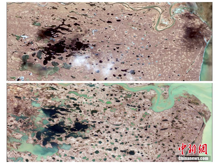 圖為(wei) 青海省南部星宿海2013年(上圖)和2022年(下圖)“千湖美景”對比。劉錦秀 供圖
