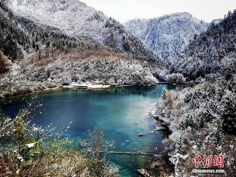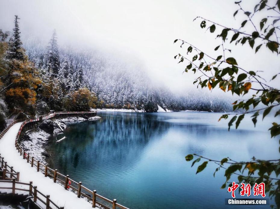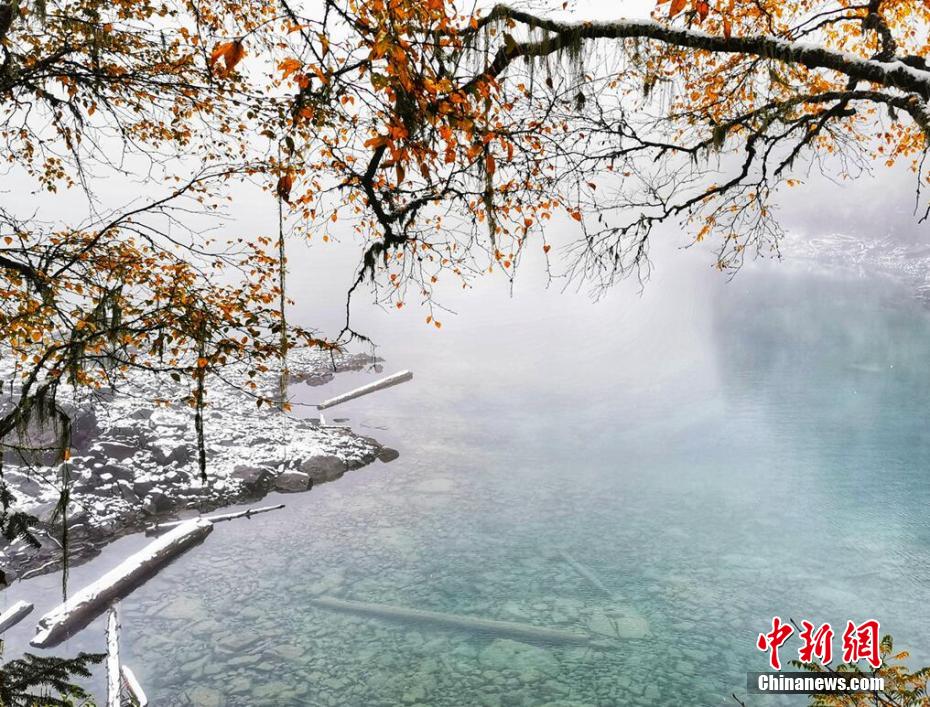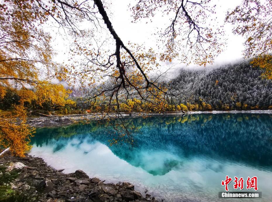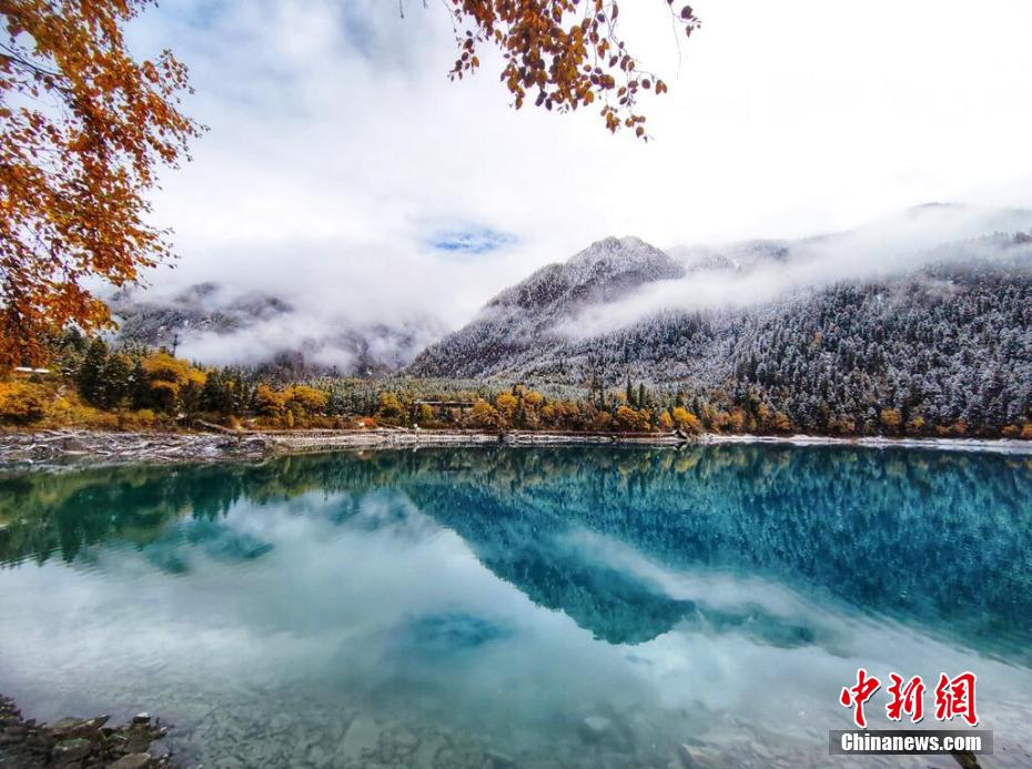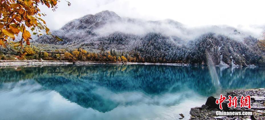 十月,九寨溝長海、原始森林等景點迎來入秋後的第一場雪。澄淨碧藍的海子和金色的彩林與(yu) 潔白的雪花相映相襯,構成一幅靜謐的美麗(li) 畫卷。遠遠看去,成片的彩林被一朵朵雪花點綴,美得像童話世界一般。 梁峰 攝