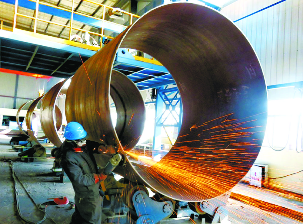 在青海華匯新能源有限公司的生產(chan) 車間裏,工人正在切割製作風力發電組件。蘇烽 攝