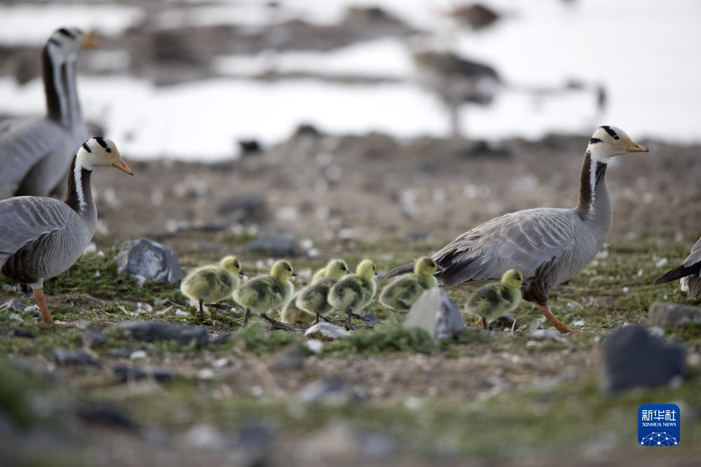 幾隻斑頭雁在青海湖鳥島濕地活動(2020年6月2日攝)。新華社 星智 攝