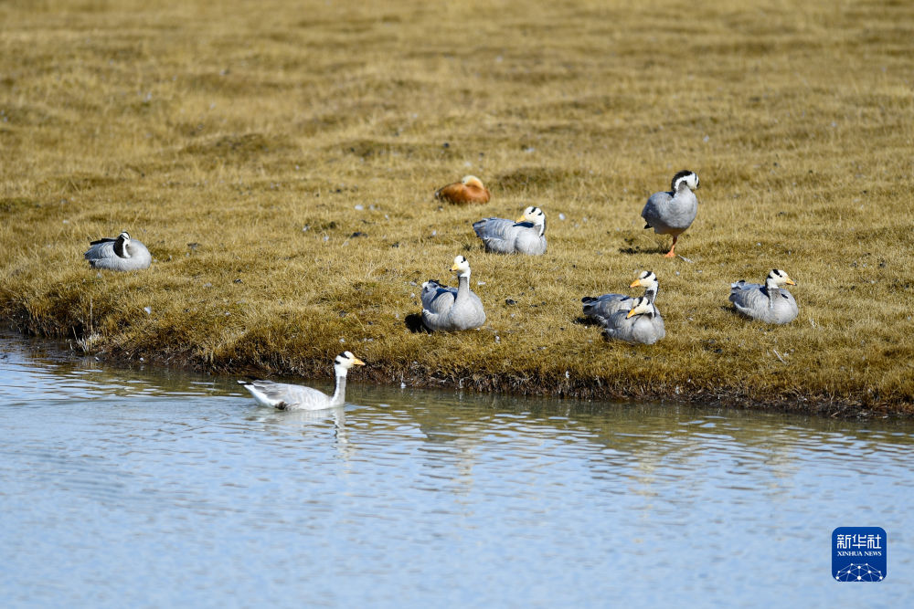 在三江源國家公園黃河源園區拍攝的一群斑頭雁。(新華社記者 李占軼 攝)