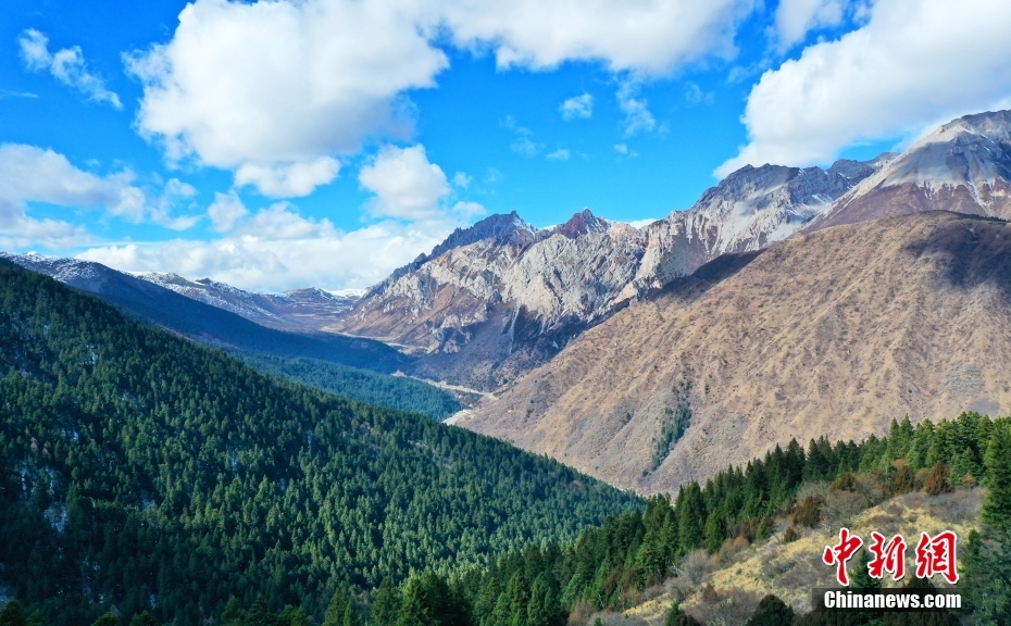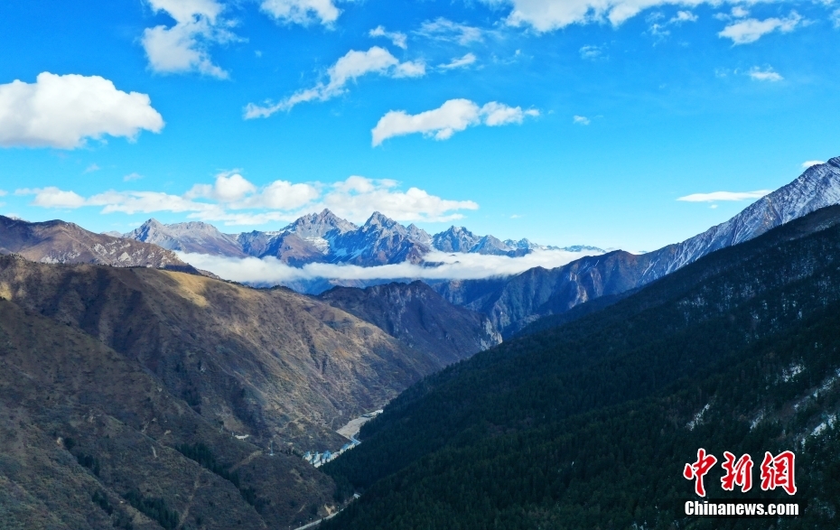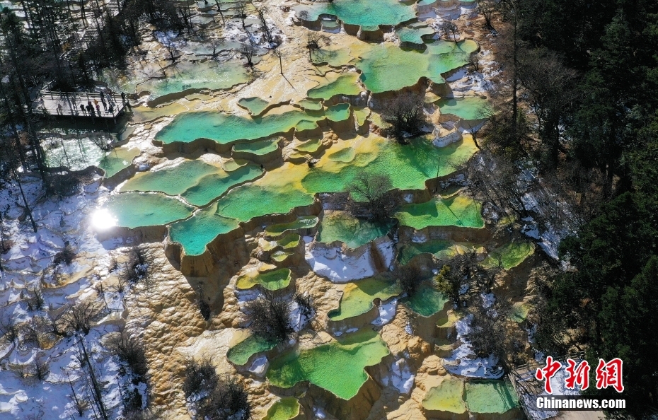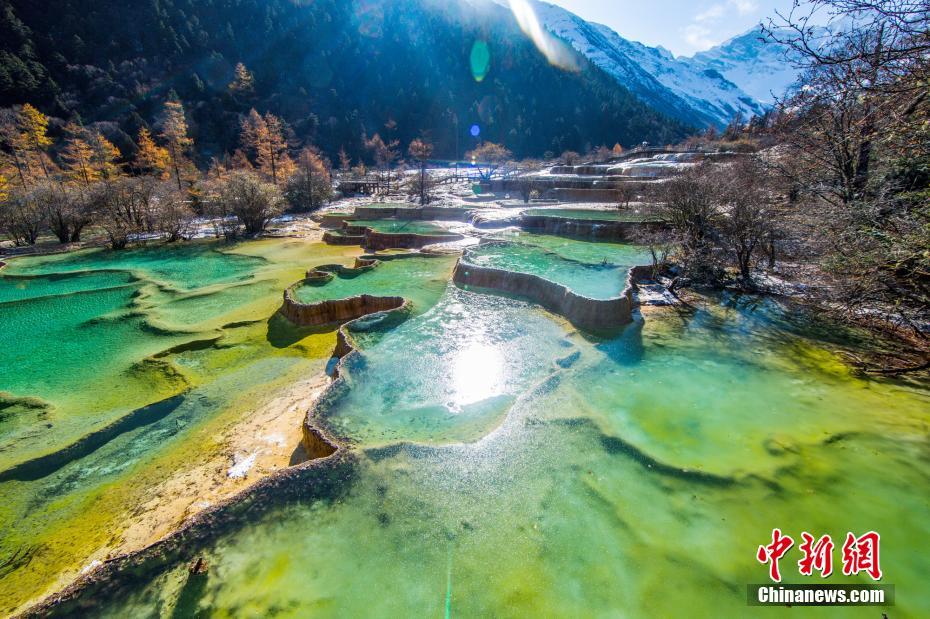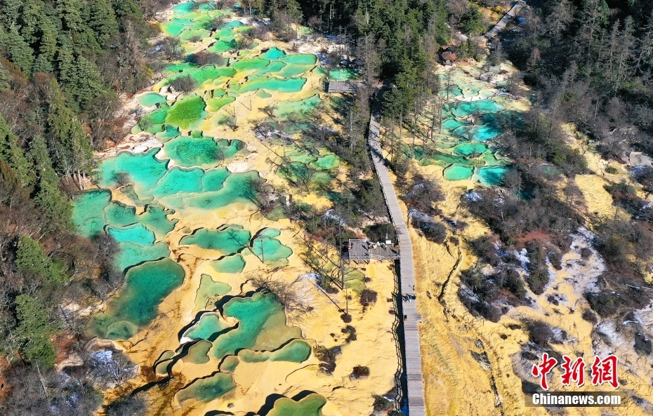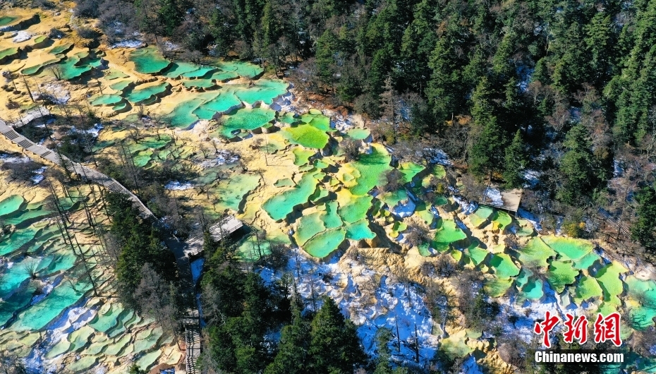 11月18日,航拍四川省阿壩藏族羌族自治州鬆潘縣黃龍景區風光。(無人機照片) 中新社記者 安源 攝