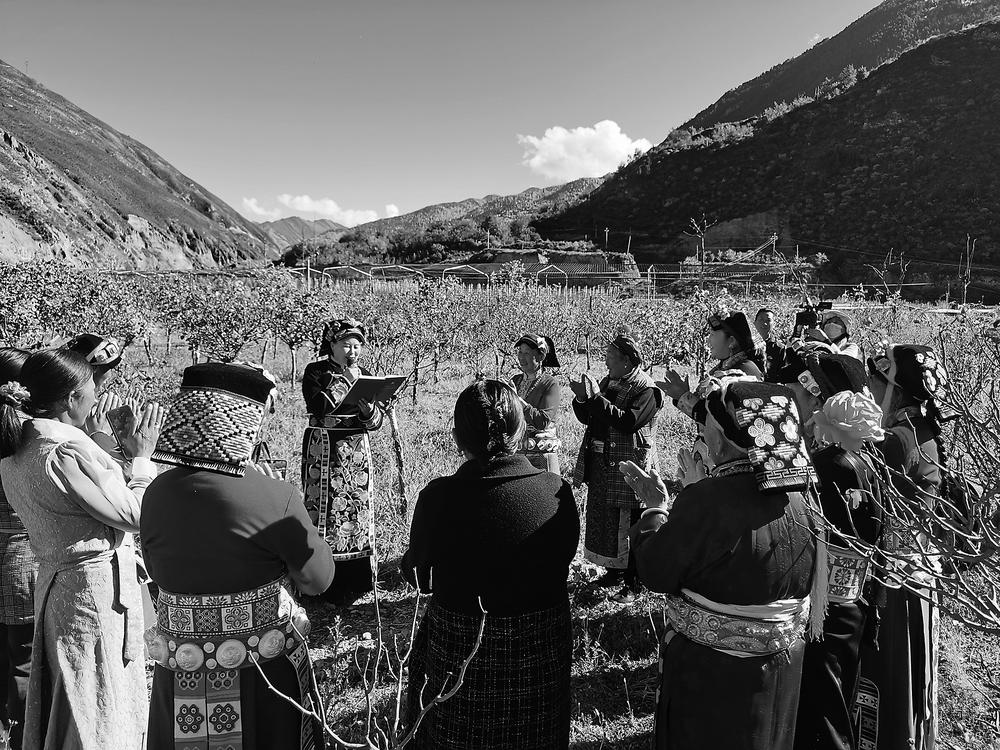陳望慧(圖中)在勞動間隙向藏族群眾(zhong) 宣講黨(dang) 的二十大精神。金宣 攝