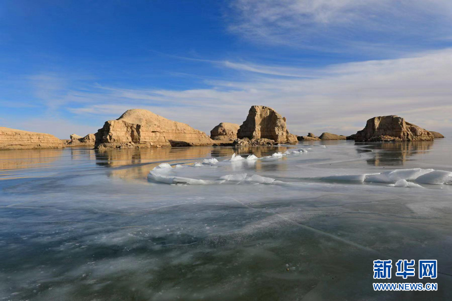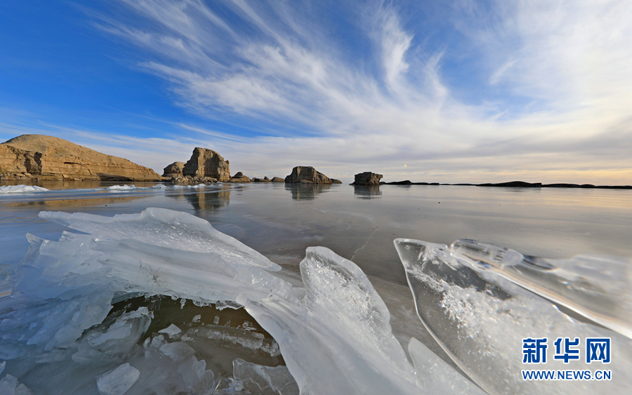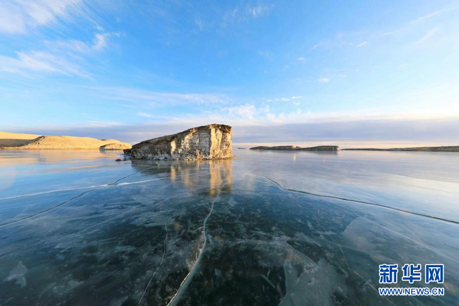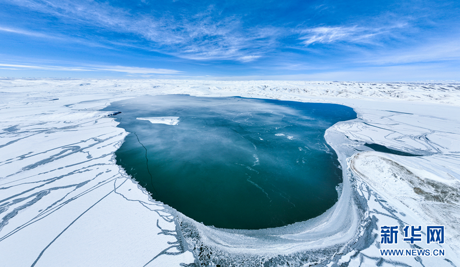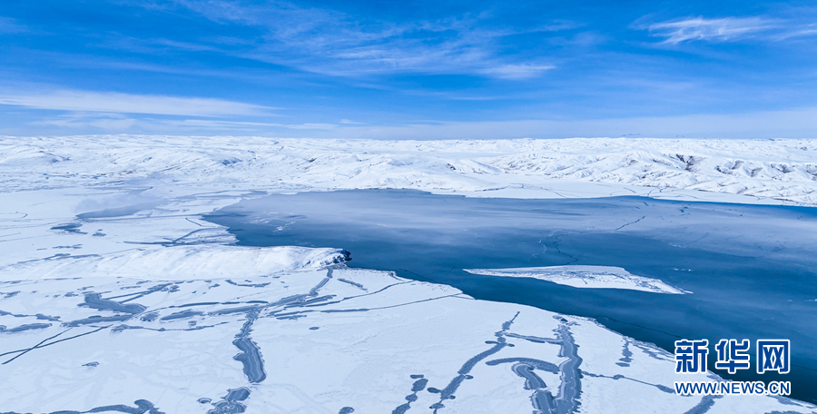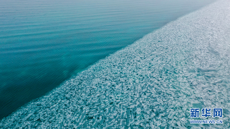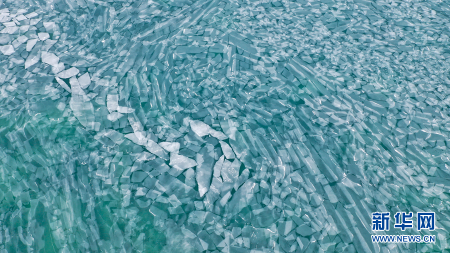 封凍的湖麵如同破碎的“玉帶”,形成獨特的景觀。新華網發(宋忠勇 攝)