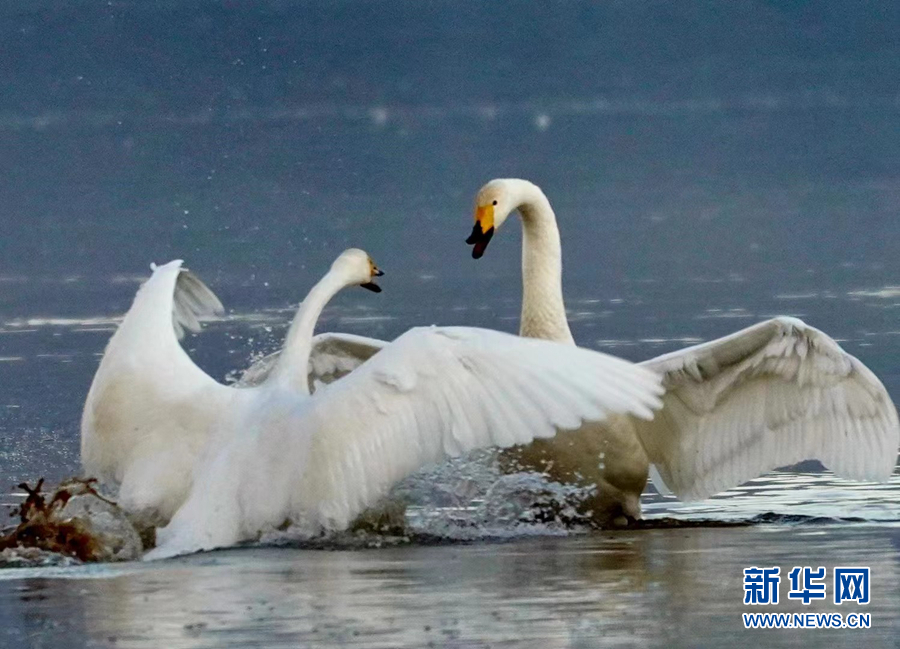 兩(liang) 隻大天鵝在水麵嬉戲。新華網發(李玉峰 攝)
