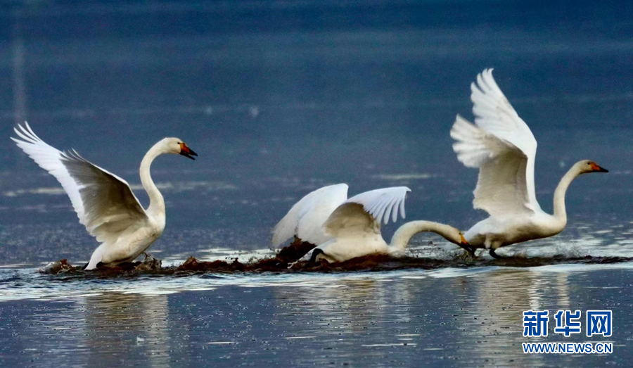 三隻大天鵝在水麵嬉戲。新華網發(李玉峰 攝)
