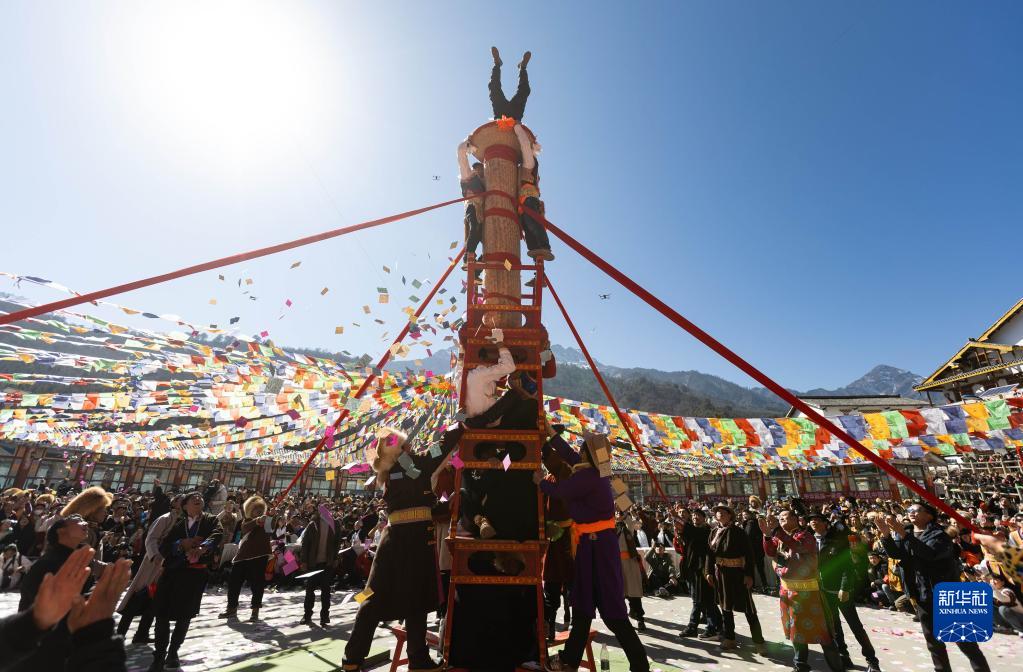 1月30日,當地藏族群眾(zhong) 表演傳(chuan) 統民俗雜技“天鵝抱蛋”。新華社記者 江宏景 攝