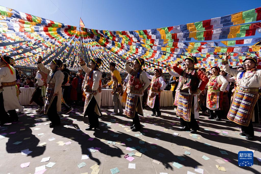 1月30日,身著盛裝的藏族青年男女跳著歡快的舞蹈。新華社記者 江宏景 攝