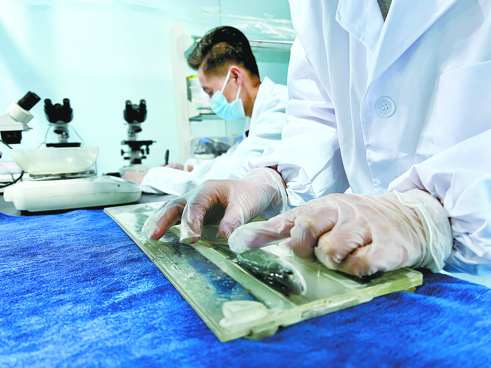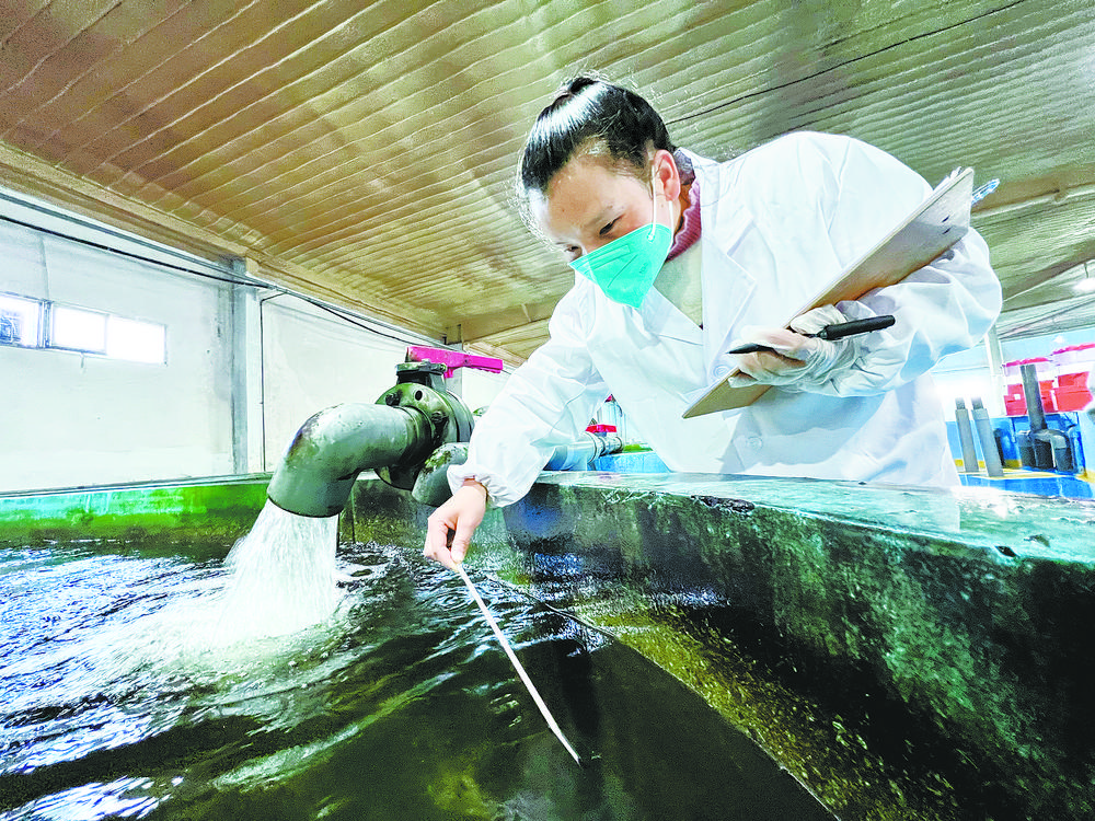 技術人員記錄循環水養(yang) 殖池的水體(ti) 溫度。
