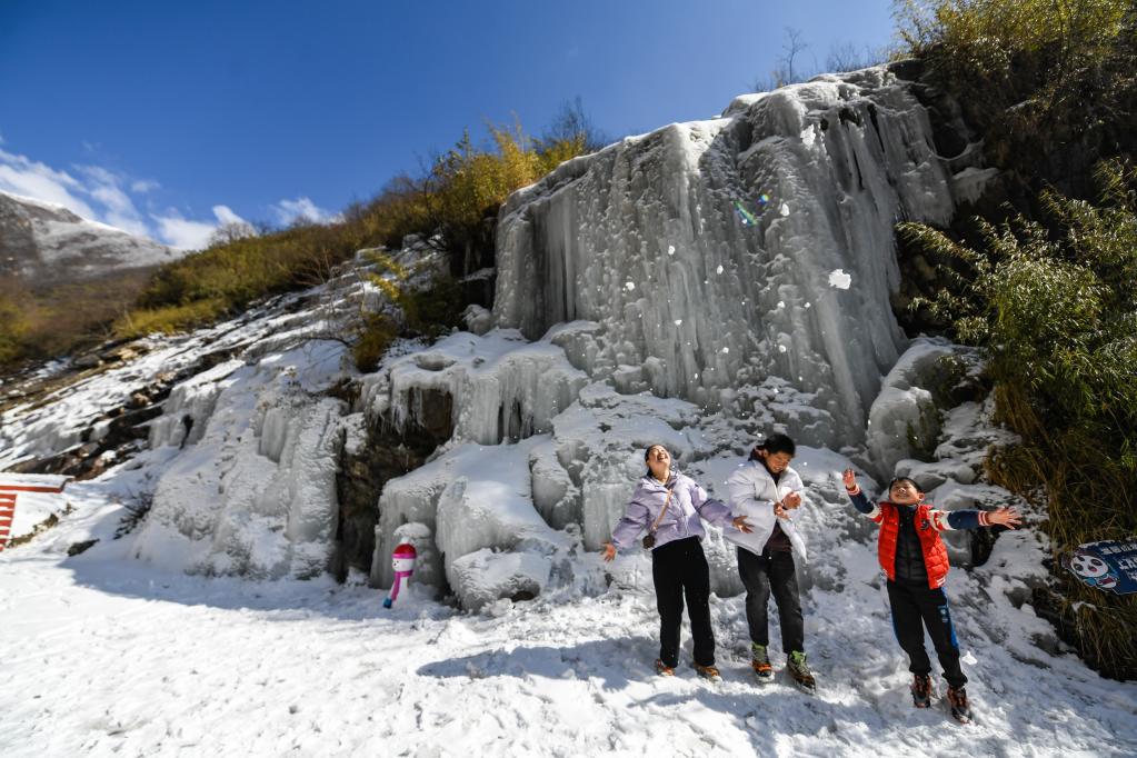2月9日,來自成都的遊客在克枯村的冰瀑下玩雪。新華社記者 王曦 攝
