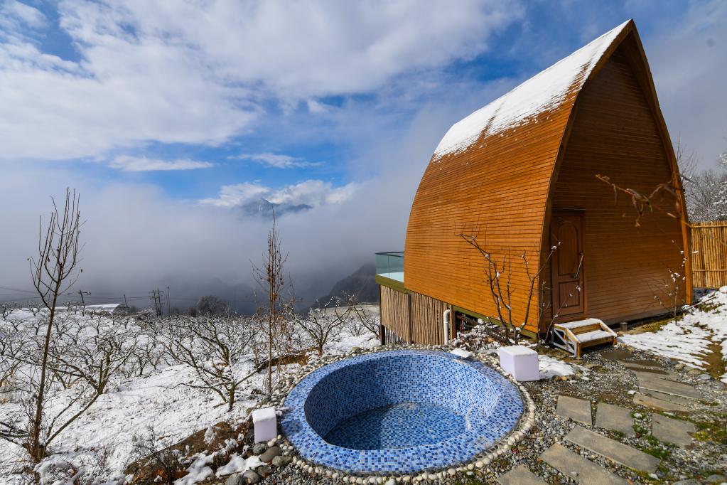 克枯村位於(yu) 長江上遊支流岷江邊的山腰上,是羌族聚居村寨。記者日前沿盤山公路進入村中看到,李子樹枝幹上掛滿雪花,山林裏6棟複式獨棟木屋民宿與(yu) 遠處的雪山峽穀遙相呼應,旁邊是視野開闊的網紅餐廳,沿著旅遊步道前行便看到幽蘭(lan) 深邃的冰瀑群。