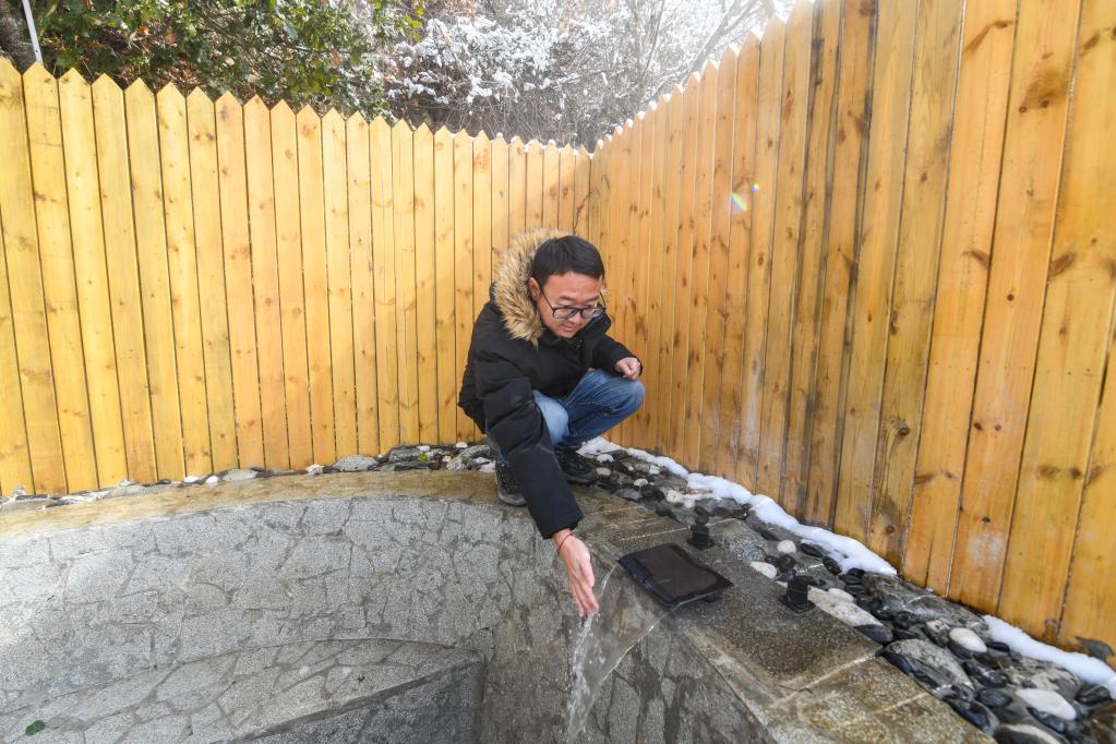 2月9日,鍾毅在小木屋內(nei) 的溫泉浴池旁試水溫。新華社記者 王曦 攝