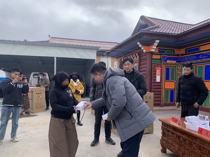 為(wei) 覺日村群眾(zhong) 發放手機。