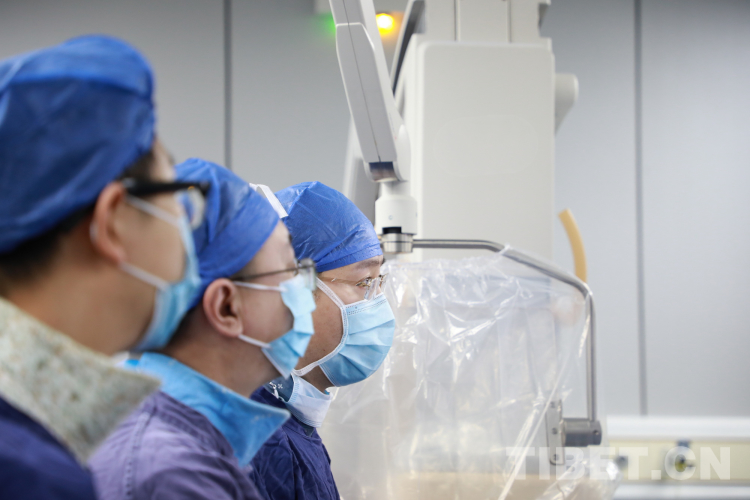 圖為(wei) 北醫三院院長助理唐熠達教授(右一)帶領專(zhuan) 家團隊在為(wei) 來自青海省果洛藏族自治州的先心病患兒(er) 手術時觀察導管行進情況 攝影:劉莉