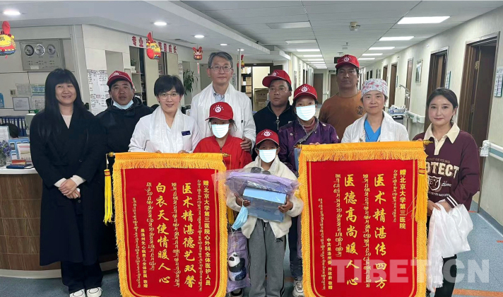 圖為(wei) 3名來自青海省果洛藏族自治州的先心病患兒(er) 及患兒(er) 家屬等向北醫三院敬贈錦旗 攝影:宮禧