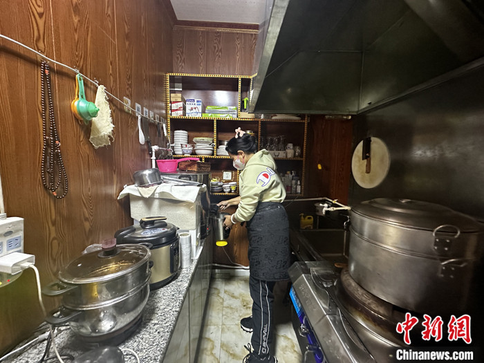 資料圖為(wei) 長江源村的一家藏餐吧內(nei) ,店主李新財的妻子在忙碌。 中新社記者 李雋 攝