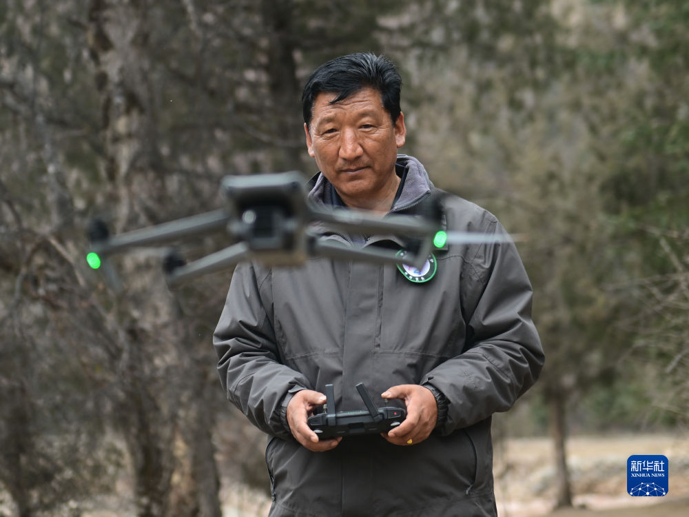3月24日,在青海省黃南藏族自治州麥秀林場,護林員使用無人機巡護林區。新華社記者 王豔 攝