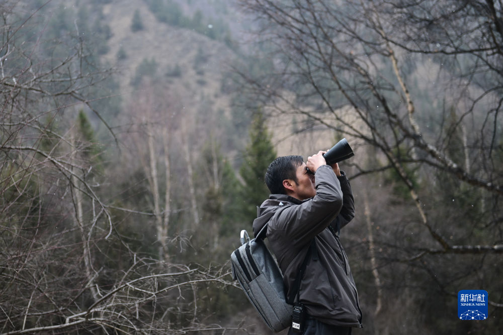3月24日,在青海省黃南藏族自治州麥秀林場,護林員使用望遠鏡巡護林區。新華社記者 張龍 攝