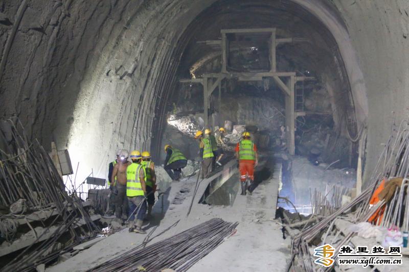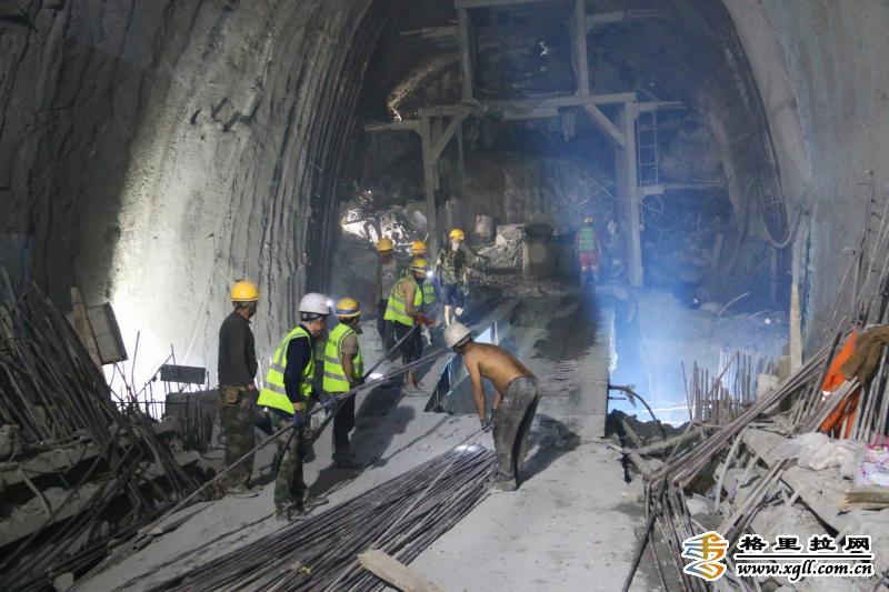 施工隧道內(nei) ,工人們(men) 在機器轟鳴聲中有序施工,隧道內(nei) 最高溫度達42℃,艱苦的施工環境和複雜多變的地質環境給施工進度製造了重重壓力。