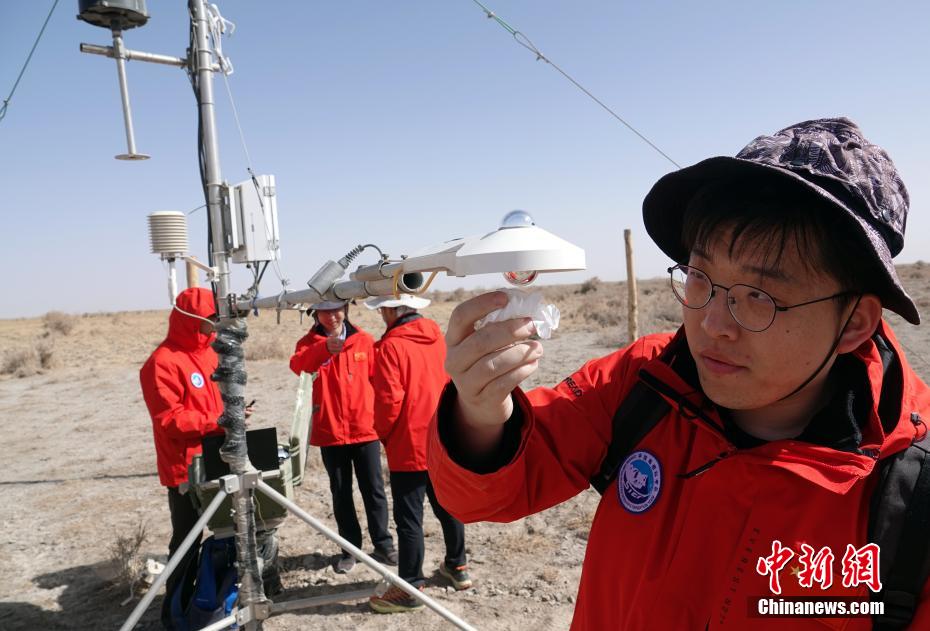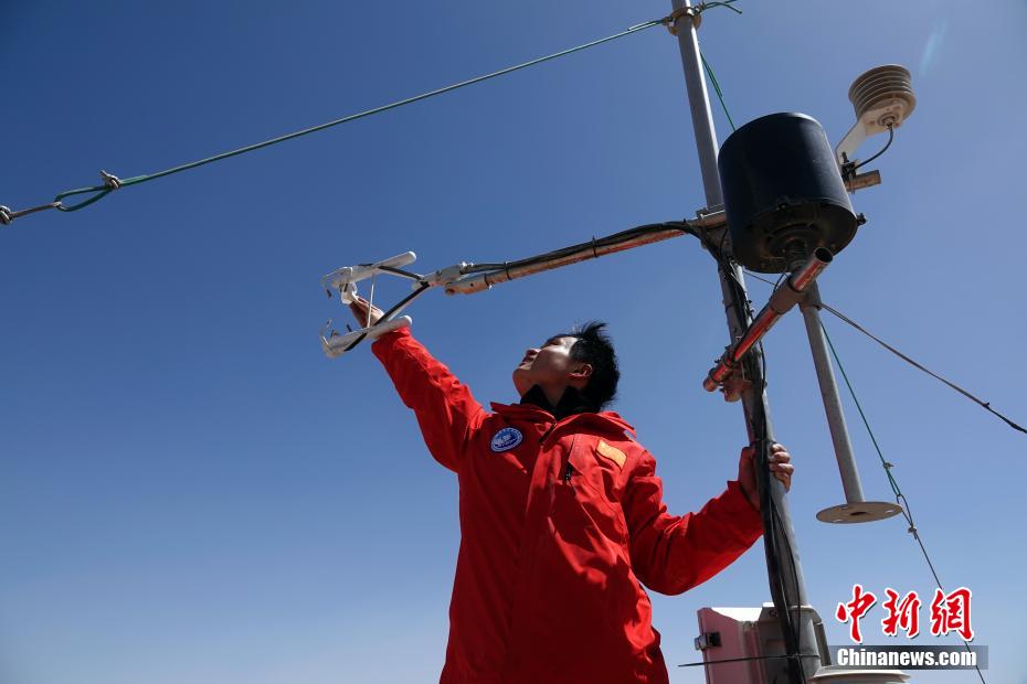 第二次青藏科考隊員、中科院空天院博士生呂雲(yun) 哲在觀測站現場維護擦拭觀測設備探頭。中新社記者 孫自法 攝