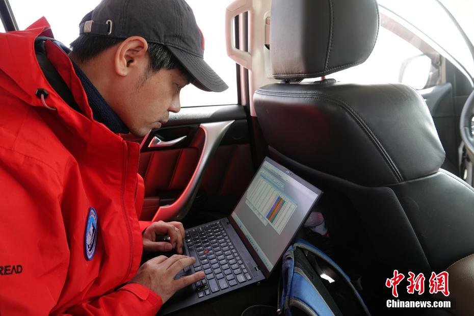 觀測站現場,第二次青藏科考隊員、中科院空天院鄭超磊副研究員隨即在車上進行數據初步檢查處理工作。中新社記者 孫自法 攝