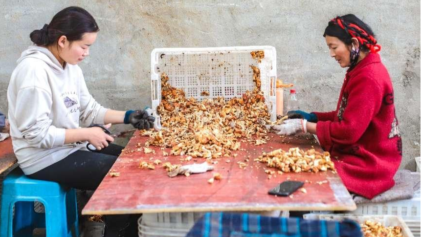 在園區挑選鬆茸的村民(央廣網發 中共雅江縣委宣傳(chuan) 部供圖)