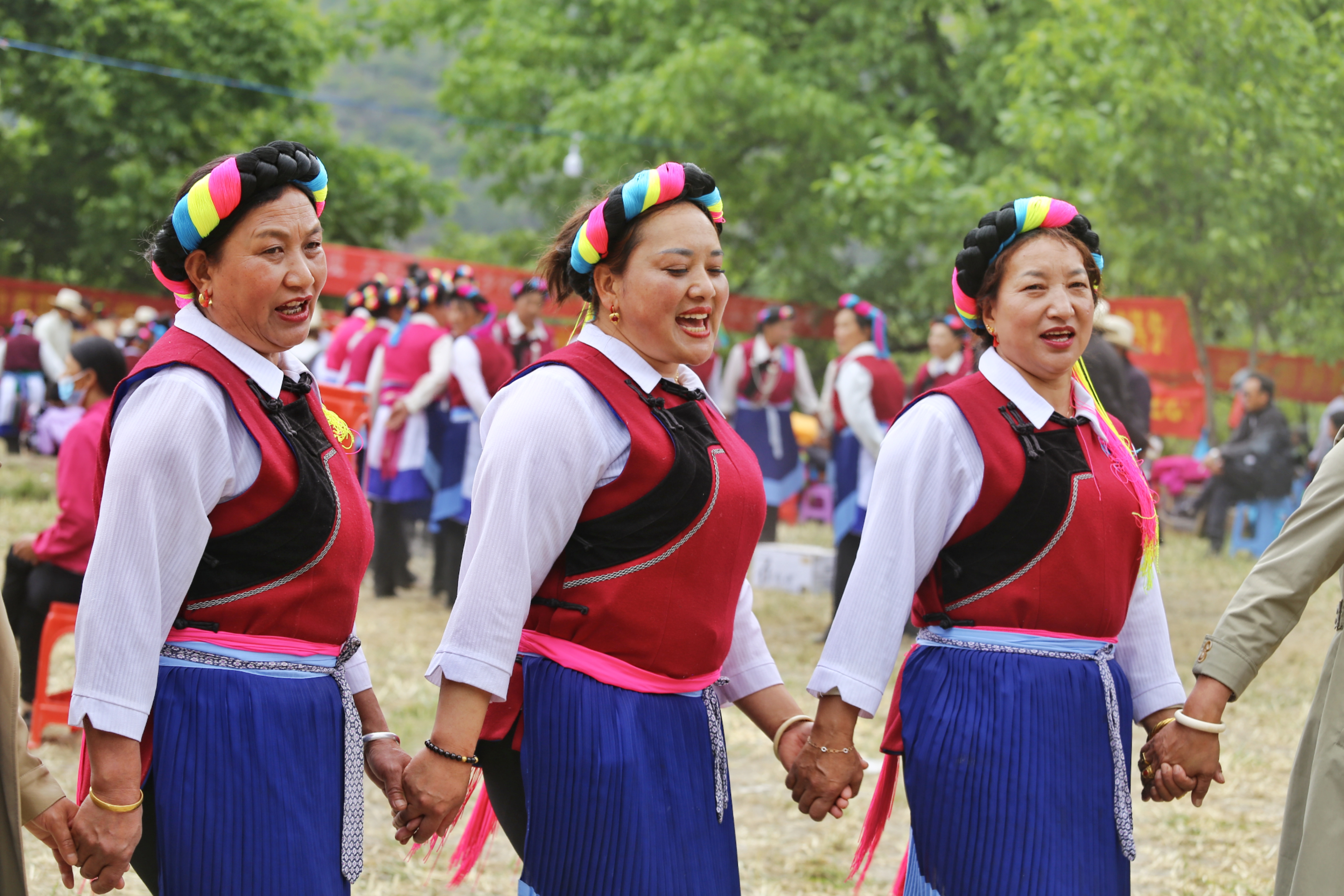 藝術節開幕式上,《最美的歌兒(er) 唱給黨(dang) 》《傳(chuan) 統熱巴》《編雙草鞋送紅軍(jun) 》《犁田調》《遇見卓瑪》等節目向觀眾(zhong) 展示了其宗厚重的文化底蘊和村民生活的變化。伴隨著悠揚的歌聲,“四縣”各族兒(er) 女手挽手、肩並肩,圍成同心圓共舞“千人鍋莊”,水袖揮舞,褶裙搖曳,場麵壯觀,遊客們(men) 紛紛拿出手機記錄這場視覺盛宴。