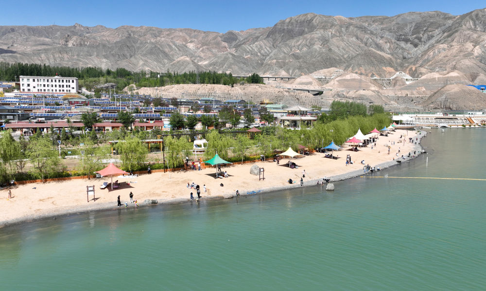 5月13日,遊客在黃河上遊尖紮段岸邊遊玩(無人機照片)。新華社記者 張宏祥 攝