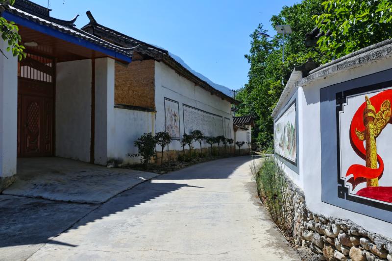 初夏時節,走進香格裏拉市金江鎮吾竹村堆滿一組,映入眼簾的是遠山青黛、碧水田園,房前屋後古樹紅花相映,鄉(xiang) 間小道兩(liang) 側(ce) 果樹成蔭,一幅幅包含該村文化曆史的彩繪躍然牆上,漫步其間好不愜意。