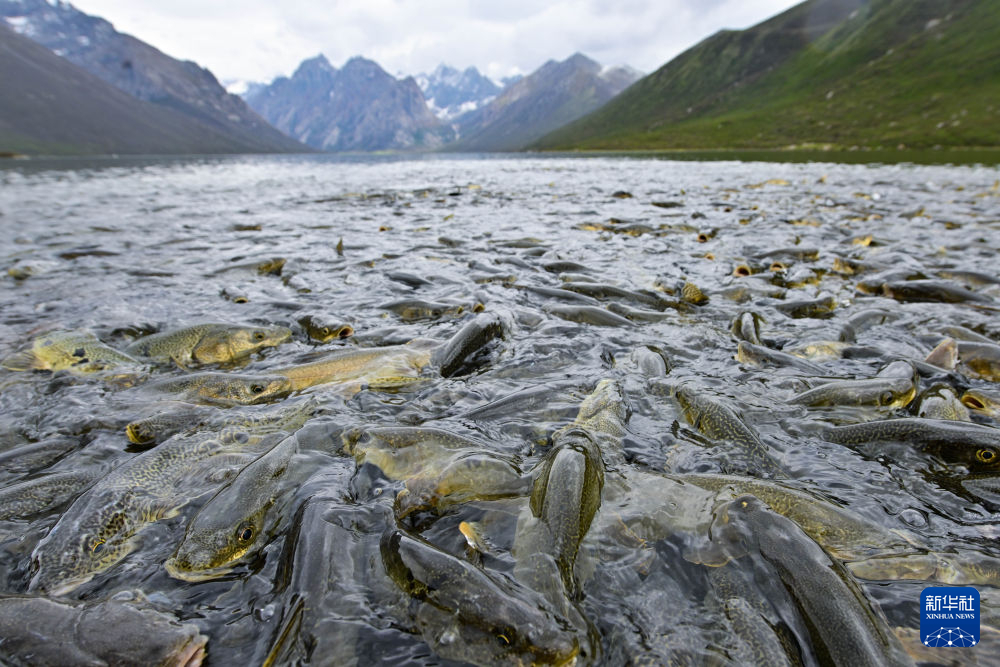6月11日,在青海省果洛藏族自治州久治縣境內(nei) 的年保玉則,裸鯉在水中活動。新華社記者 張龍 攝
