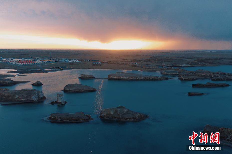 6月24日,清晨的降雨過後,青海省海西蒙古族藏族自治州大柴旦烏(wu) 素特(水上)雅丹天空澄碧,纖雲(yun) 不染,太陽緩緩上升,給天邊鑲嵌了一條金邊,與(yu) 烏(wu) 素特(水上)雅丹遙相輝映,風光旖旎。