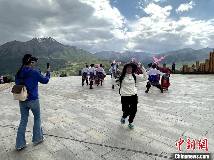 圖為(wei) 遊客與(yu) 祁連民眾(zhong) 一起跳舞。李雋 攝