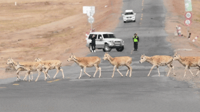 而在青藏公路這頭,可可西裏管理處安排工作人員采取短暫交通管製、禁止鳴笛、巡護救助等措施,為(wei) 藏羚羊遷徙產(chan) 仔保駕護航。伴隨遷徙高峰期的到來,藏羚羊“過公路”已經成為(wei) 青藏公路沿線的一道獨特風景。