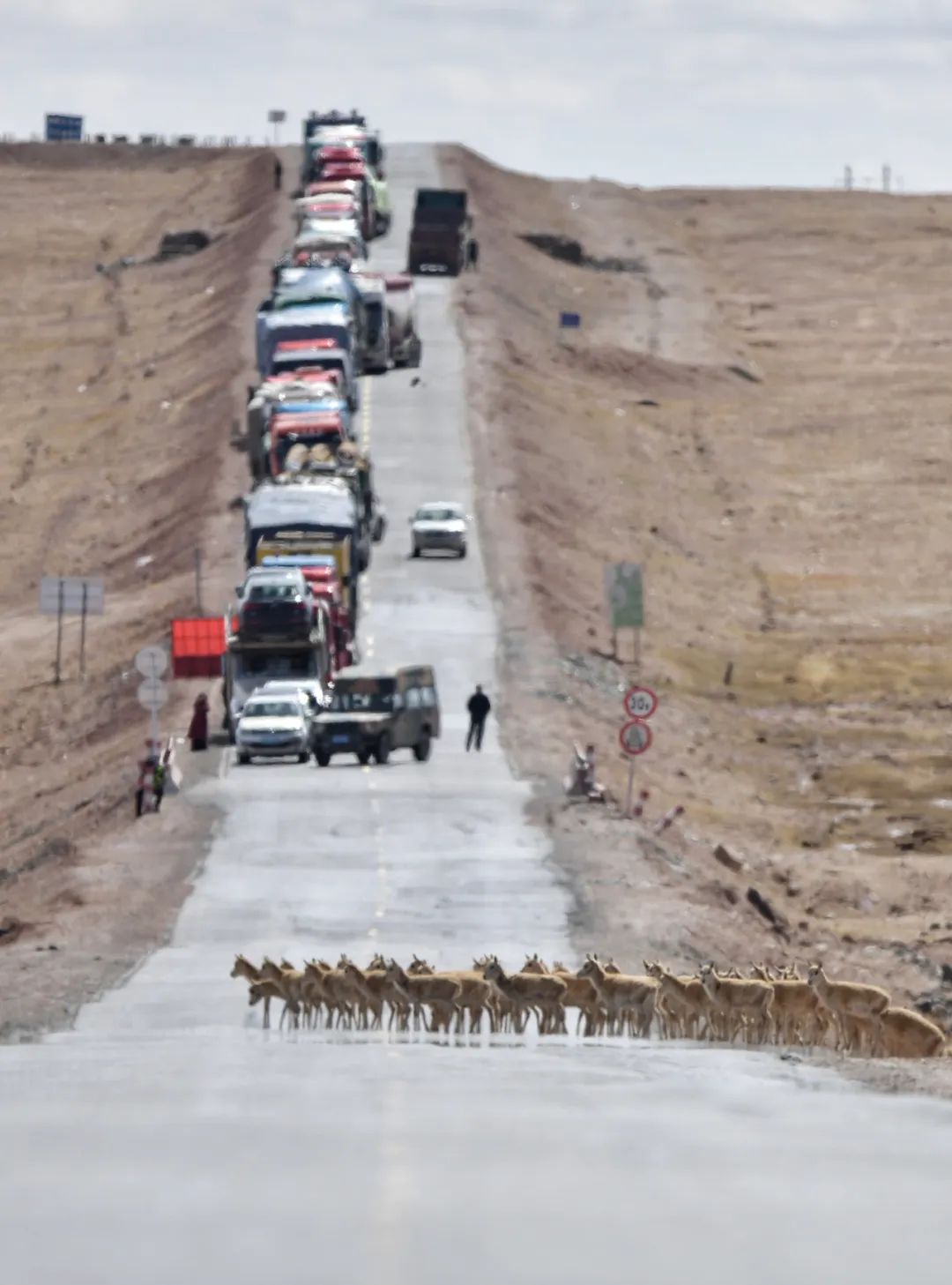 遷徙藏羚羊群經過青藏公路可可西裏五道梁路段。