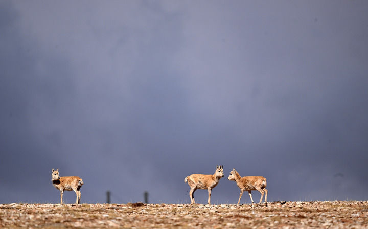 三隻藏羚羊在三江源地區活動(5月28日攝)。新華社記者 張宏祥 攝