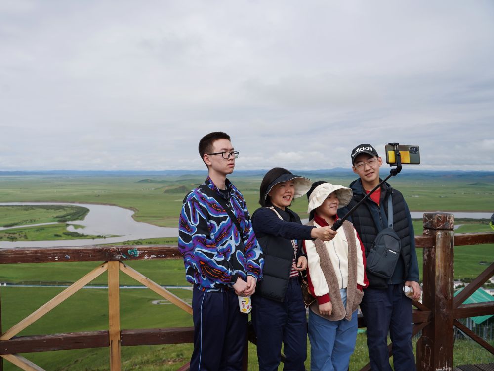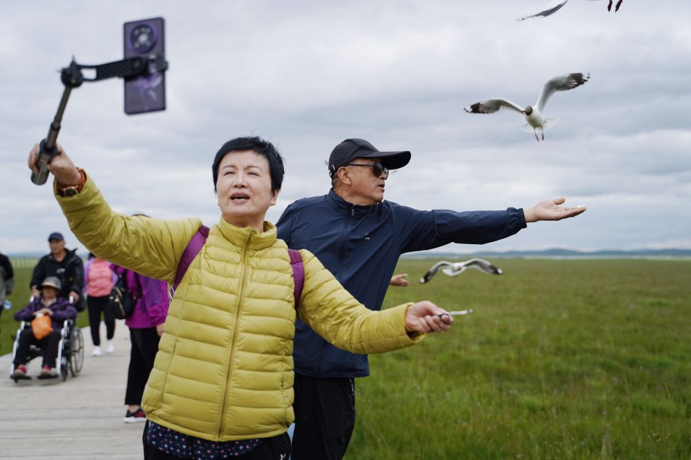 7月14日,遊客在若爾蓋縣黃河九曲第一灣景區內(nei) 拍照。新華社記者 邢拓 攝