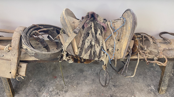圖為(wei) 五裏村村史館展覽的過去運輸貨物和生活必需品上山的馬駝用具。新華網 陳穎 攝
