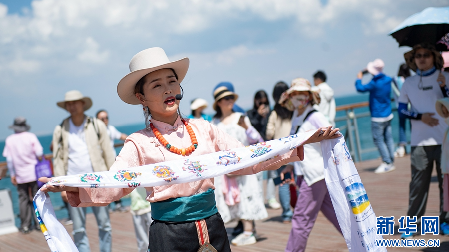 8月2日,青海湖二郎劍景區工作人員為(wei) 遊客獻上精美的舞蹈。新華網 潘彬彬 攝