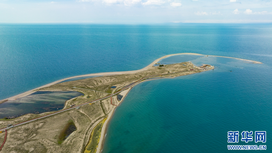 這是8月2日拍攝的青海湖二郎劍景區二郎劍半島。(無人機照片)新華網 郭勇良 攝