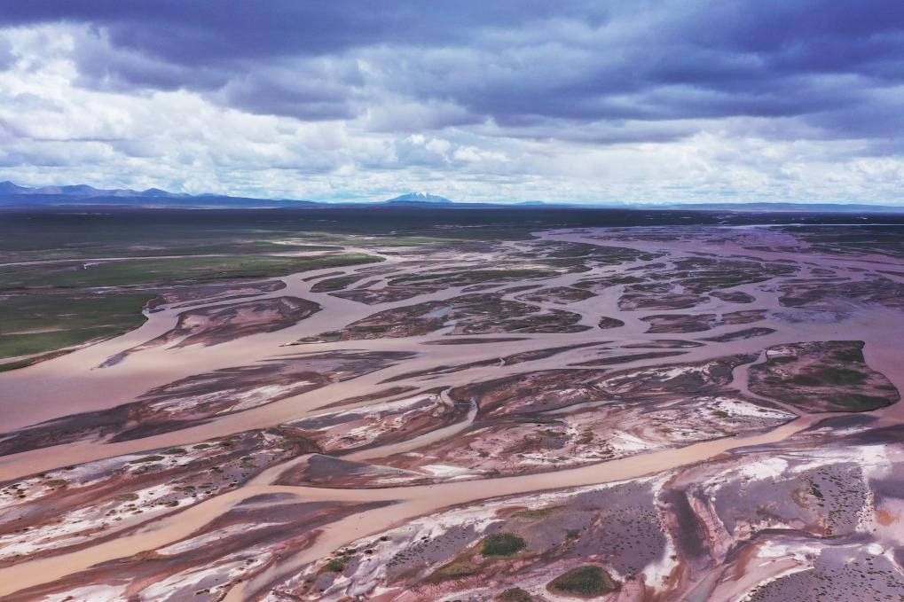 這是2023年7月26日拍攝的囊極巴隴河道,長江正源沱沱河和南源當曲在此匯合(無人機照片)。新華社記者 陳傑 攝