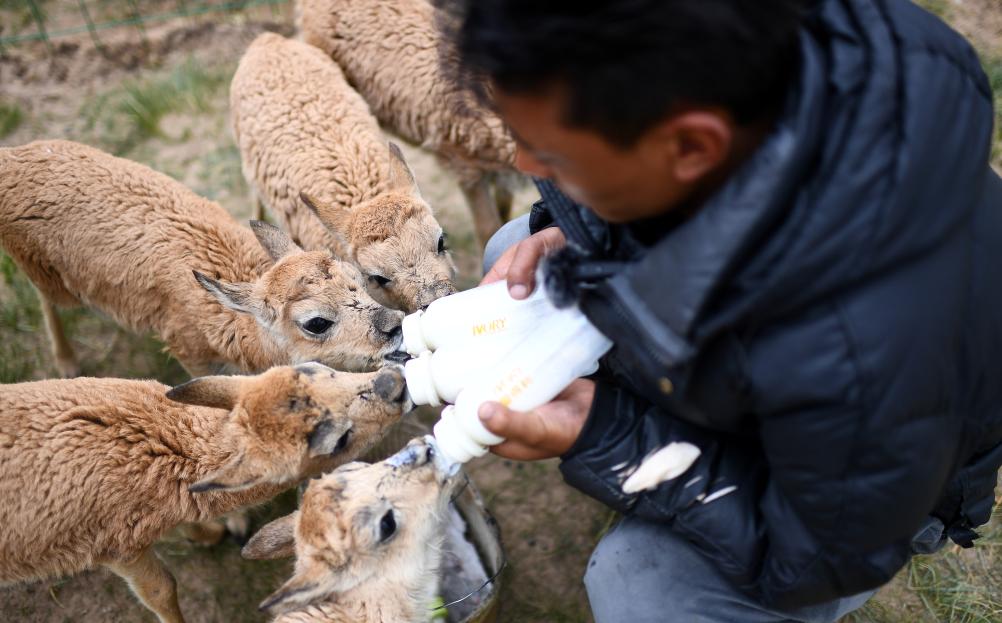 可可西裏管理處索南達傑保護站隊員才仁多傑在給被救助的藏羚羊幼仔喂奶(7月28日攝)。新華社記者 張宏祥 攝